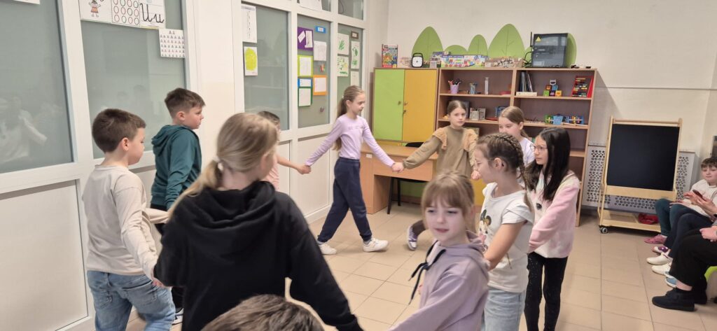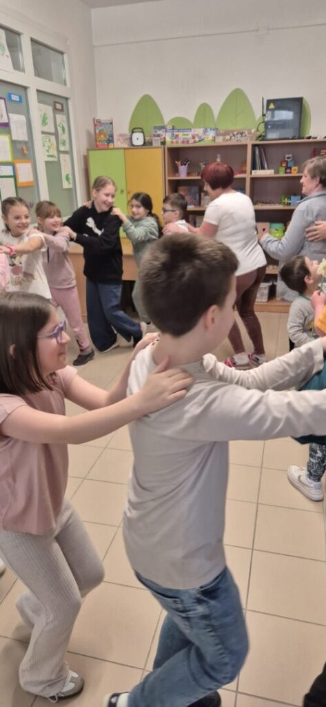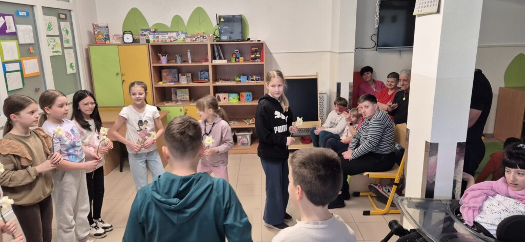 Učenici 3.a pripremili su i izveli prigodan program povodom nadolazećeg blagdana Uskrsa te pjesmom i plesom uljepšali dan korisnicima. Uručili su im prigodne darove koje su za njih pripremili učenici naše škole – slatkiše i sliku koja će krasiti njihov prostor.