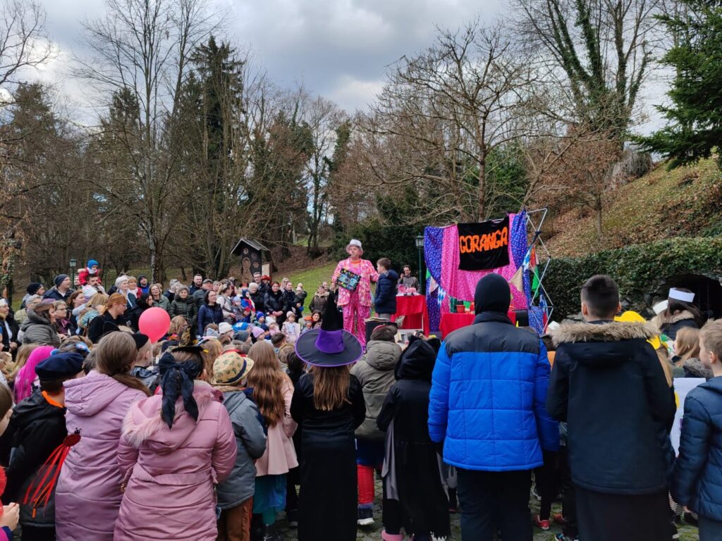 Točno u 15 sati učenici razredne nastave, zajedno s djecom iz vrtića, formirali su fašničku povorku te krenuli prema kapeli sv. Katarine. Kod kapele je održana prigodna predstava i zabava uz klauna Goranga. Predstava je u organizaciji Turističke zajednice Stubičke Toplice, pod pokroviteljstvom Općine Stubičke Toplice koji su svim posjetiteljima podijelili krafne i sok. Povorku je srdačno dočekao načelnik Josip Beljak. Uz učiteljice Mirnu Domitrek Avirović, Moniku Barić, Anitu Kobelščak, Leu Horvat, Dubravku Orešić Dreven uz učenike su bili ravnateljica Brigitte Gmaz, knjižničarka Blanka Doko, pedagog Goran Jenić i asistentica Helena Knezić.