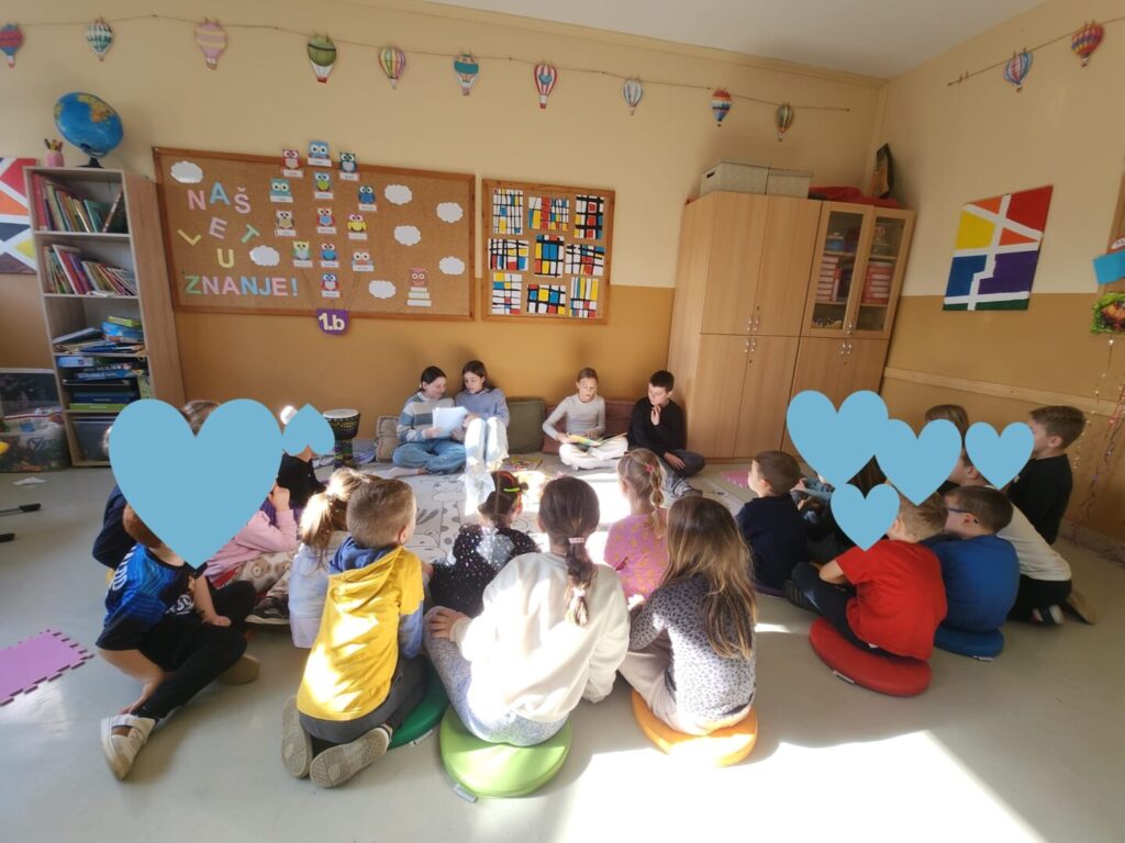 Zadnjeg dana listopada pod velikim odmorom obradovali su nas susjedi iz Dječjeg vrtića Zvirek. U našu školu zakoračilo je 24 predškolaraca iz skupine „Zvjezdice“ u pratnji odgojiteljica Ivane Lukić Habulin i Željke Fruk te asistentice Tamare. Dočekale su ih ravnateljica Brigitte Gmaz i knjižničarka Blanka Doko te ozareni članovi obitelji iz drugih razreda. Povodom Mjeseca hrvatske knjige mali su gosti poželjeli posjetiti školsku knjižnicu i otkriti kakve se sve priče i igre kriju u susjedstvu.